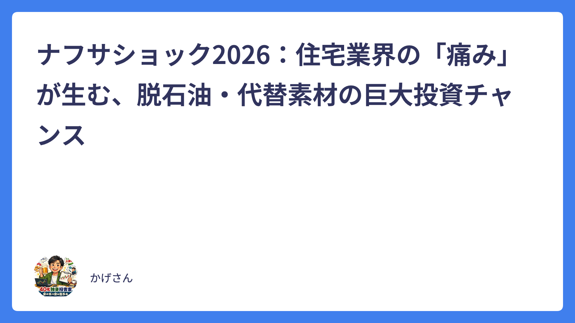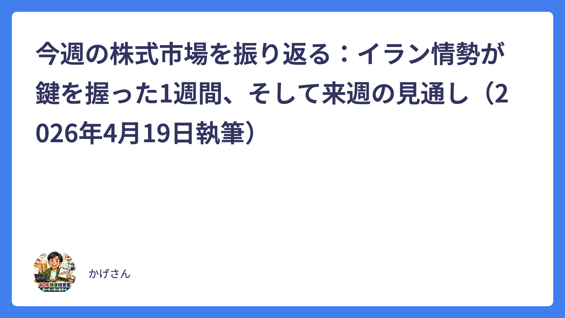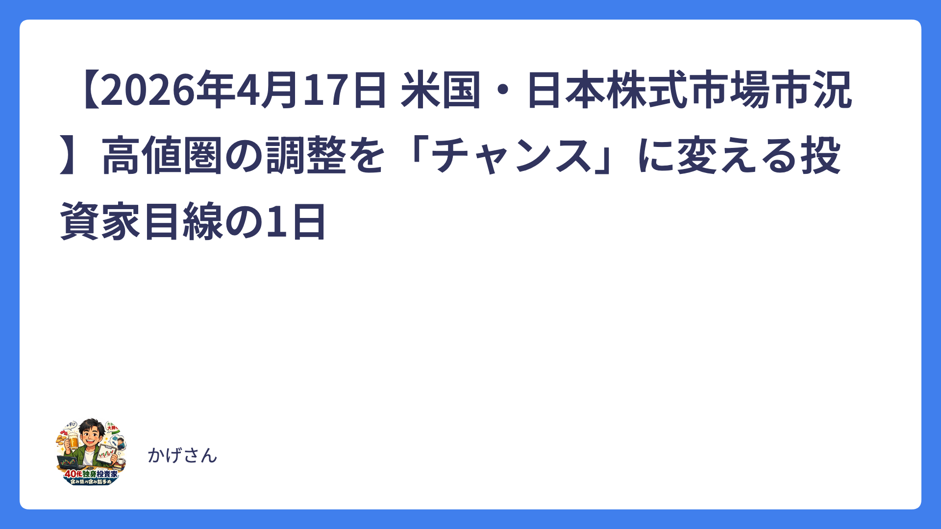 ARCHIVES 2026年4月 今週の株式市場を振り返る:イラン情勢が鍵を握った1週間、そして来週の見通し(2026年4月19日執筆) 2026.04.19 コラム heibon-ojisan 平凡なおじさんの投資ブログ 日経平均60,000円目前で止まった今週を振り返る~海外投資家の動きと、これからの日本株はどうなる?~ 2026.04.17 コラム heibon-ojisan 平凡なおじさんの投資ブログ 【2026年4月17日 米国・日本株式市場市況】高値圏の調整を「チャンス」に変える投資家目線の1日 2026.04.17 株式投資 heibon-ojisan 平凡なおじさんの投資ブログ 日経平均史上最高値更新の「見えない原動力」~一般投資家が絶対に見落とす、決算シーズンの“隠れサプライズ”が相場を本気で動かしている~ 2026.04.16 株式投資 heibon-ojisan 平凡なおじさんの投資ブログ 防衛株の下落は「米イラン停戦期待」のサイン? 原油価格急落と市場心理を徹底解説【株式投資家向け】 2026.04.16 株式投資 heibon-ojisan 平凡なおじさんの投資ブログ AI統合型SaaSの現在地~「SaaSの死」は終わったのか? 日本企業と非SaaS勢の意外な逆転劇~ 2026.04.15 コラム heibon-ojisan 平凡なおじさんの投資ブログ 【2026年4月】海外投資家が過去最高1.9兆円買い越し!毎年恒例の「4月アノマリー」で日本株はこれからどうなる?需給の裏側を徹底解説&今後の行方を大胆予測 2026.04.15 株式投資 heibon-ojisan 平凡なおじさんの投資ブログ ナフサショック2026:住宅業界の「痛み」が生む、脱石油・代替素材の巨大投資チャンス 2026.04.14 株式投資 heibon-ojisan 平凡なおじさんの投資ブログ 今日の日本株ブログ:2026年4月14日(火)「日経平均は爆上げ+1,300円超も…参加銘柄は意外と少ない?」 2026.04.14 株式投資 heibon-ojisan 平凡なおじさんの投資ブログ 2026年4月13日 日本株速報ブログ「全体は軟調…でもこの5銘柄が爆上げ! 似た事業の“次に来る株”も要チェック」 2026.04.13 株式投資 heibon-ojisan 平凡なおじさんの投資ブログ もっと見る